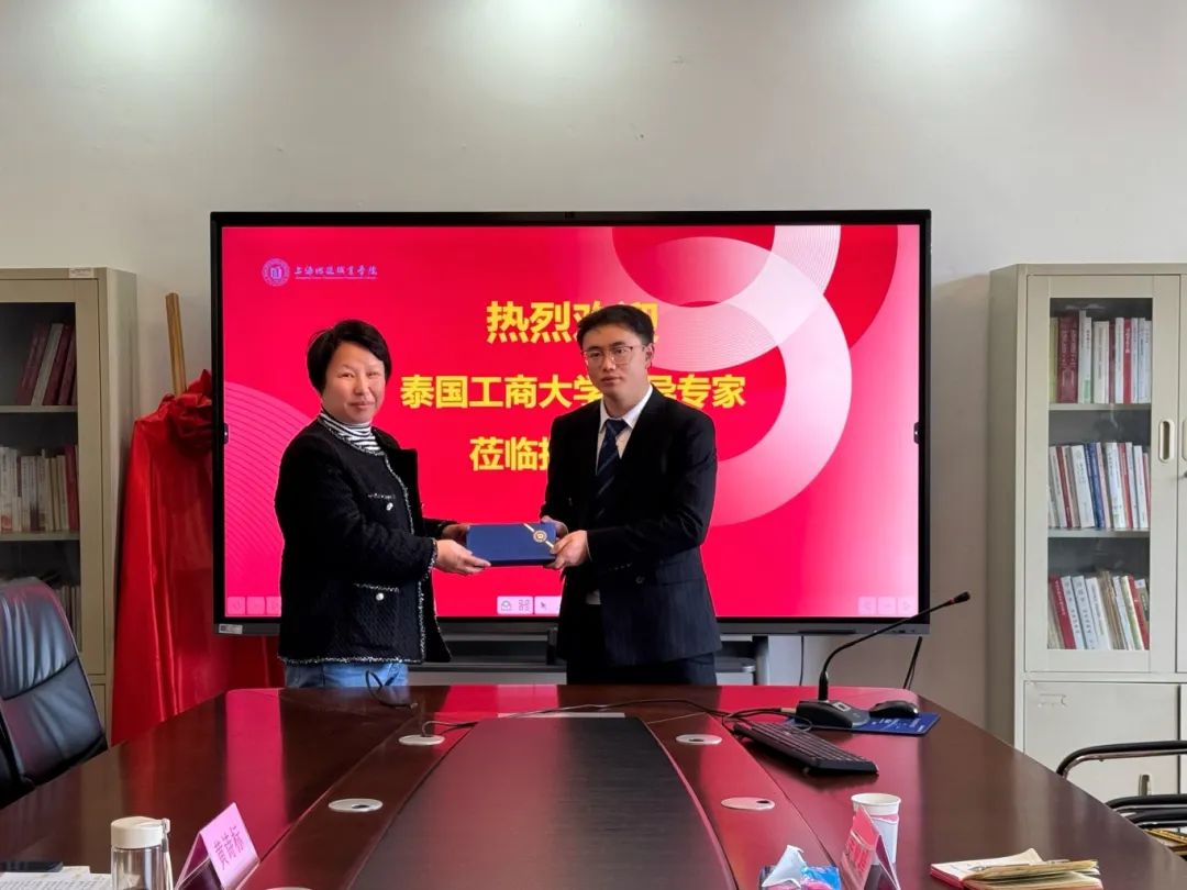 为推进职业教育国际化发展,推进“一带一路”国家合作院校在人才培养、科学研究及文化交流领域的合作,增进泰国工商大学与中国高校校际交流,泰国工 商大学国际学院副院长郑智予、留学服务中心市场负责人邹严颉于2024年12月9日到上海城建职业学院拜访,以开展关于国际教学合作交流相关事宜。上海城建职 业学院继续教育学院党总支书记黄诗标、继续教育学院副院长汤鸿、国际交流处处长于丽敏出席会议并接待泰国工商大学的到访。