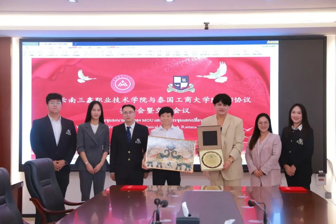 2025年5月14日,泰国工商大学国际学院执行院长Dr.SITTICHOK JALERNKIJ、泰国工商大学国际学院副院长郑智予、国际学院院长助理兼翻译陈月姮、国际学院市场部负责人邹严颉一行到访云南三鑫职业技术学院。云南三鑫职业技术学院副校长李建波、国际交流服务中心主任马婷、国际交流服务中心教师万志芳等领导出席会议并接待泰国工商大学代表团的到访,双方就国际合作办学、师生交流、学历提升等议题展开深入探讨,并正式签署合作备忘录(MOU),标志着两校合作迈入新阶段。