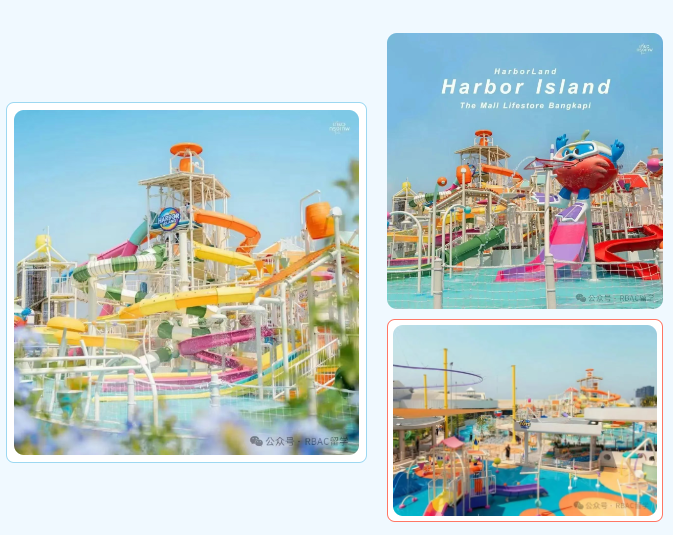 特色:泰国最大屋顶水上乐园,占地10,000㎡,分为Harbor Island冒险区(高空滑道、懒人河)和Harborland室内区(亲子互动、AR游戏)。