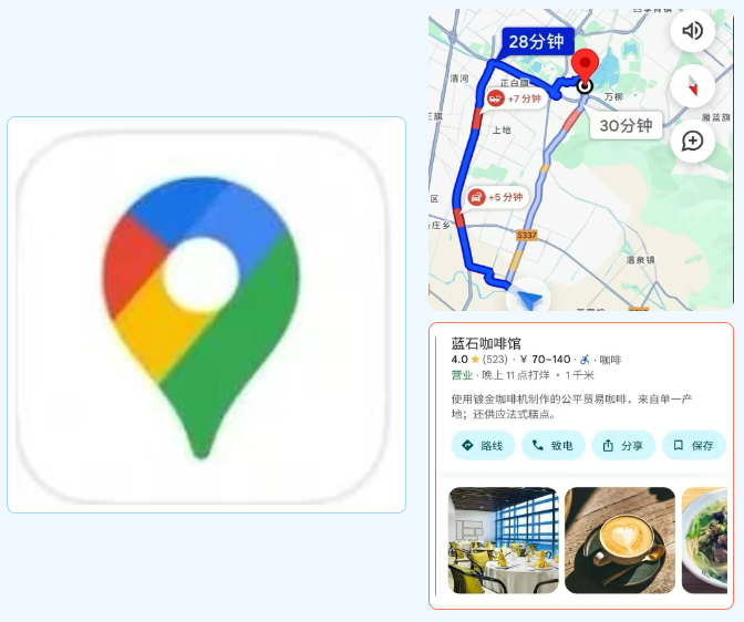 功能:实时导航、公交线路查询、周边餐厅评分、步行/骑行路线。