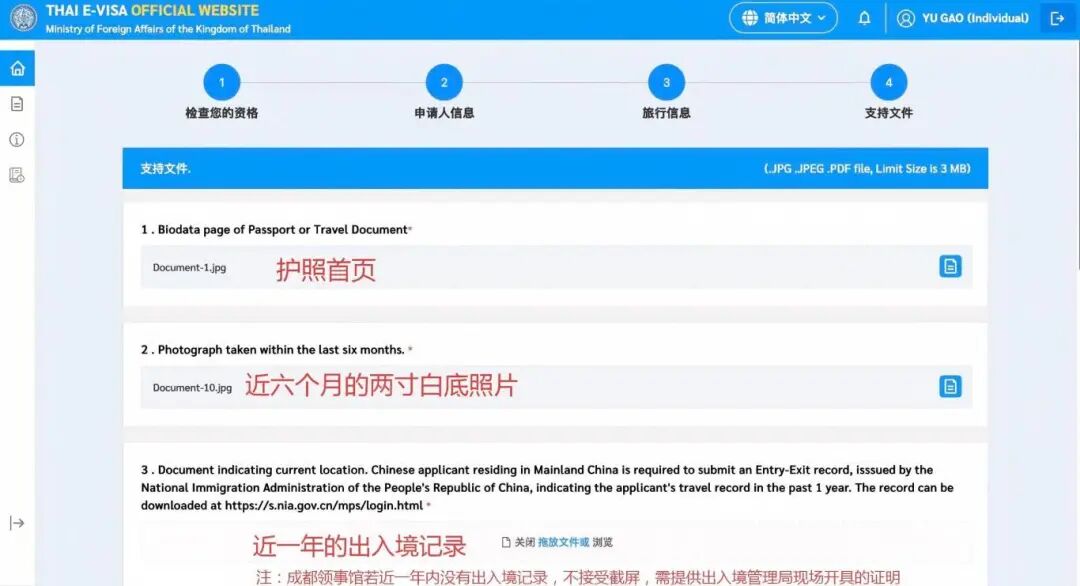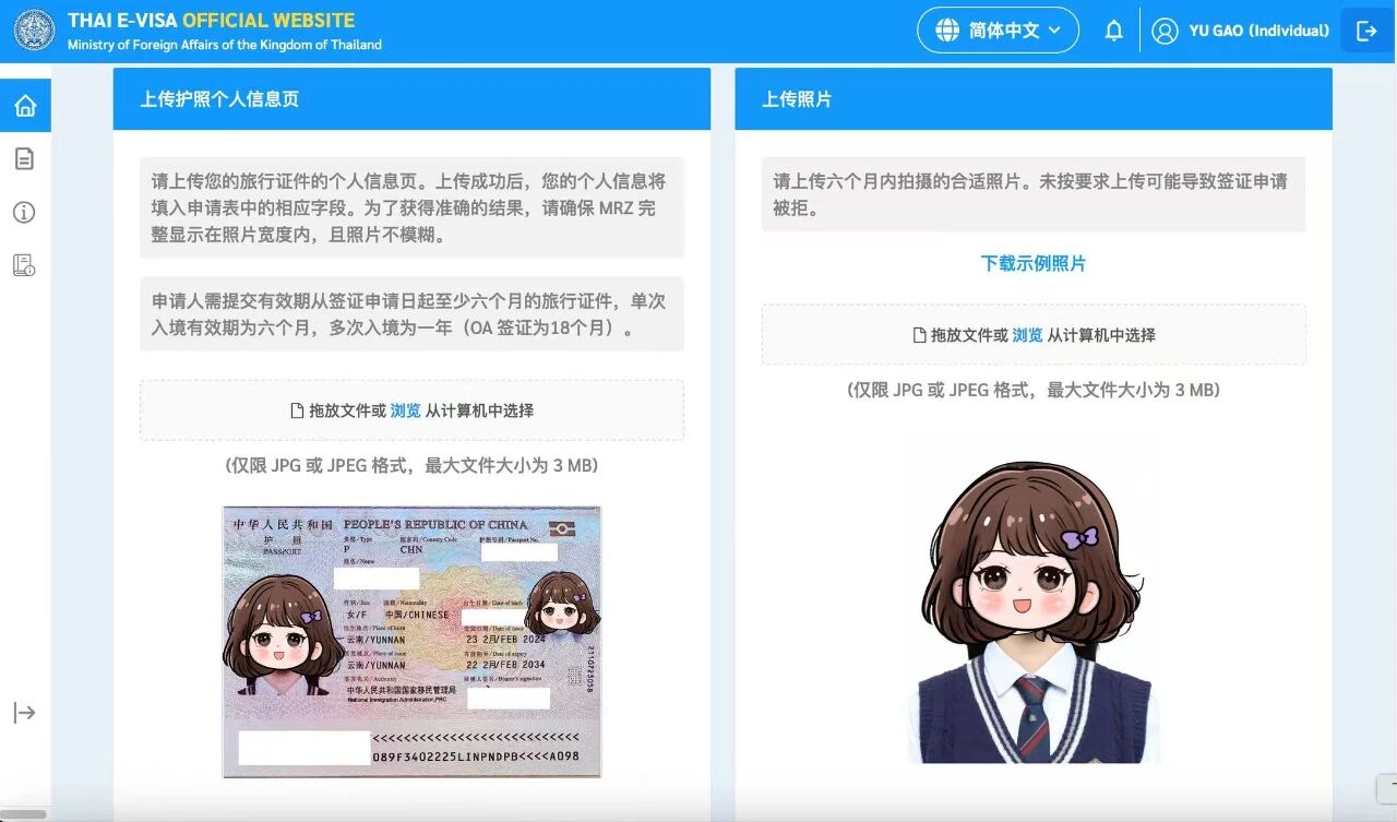 上传个人信息页:有限期六个月以上的护照首页及白底证件照(尺寸3.5×4.5cm)仅限JPG或JPEG格式,最大文件大小为3M