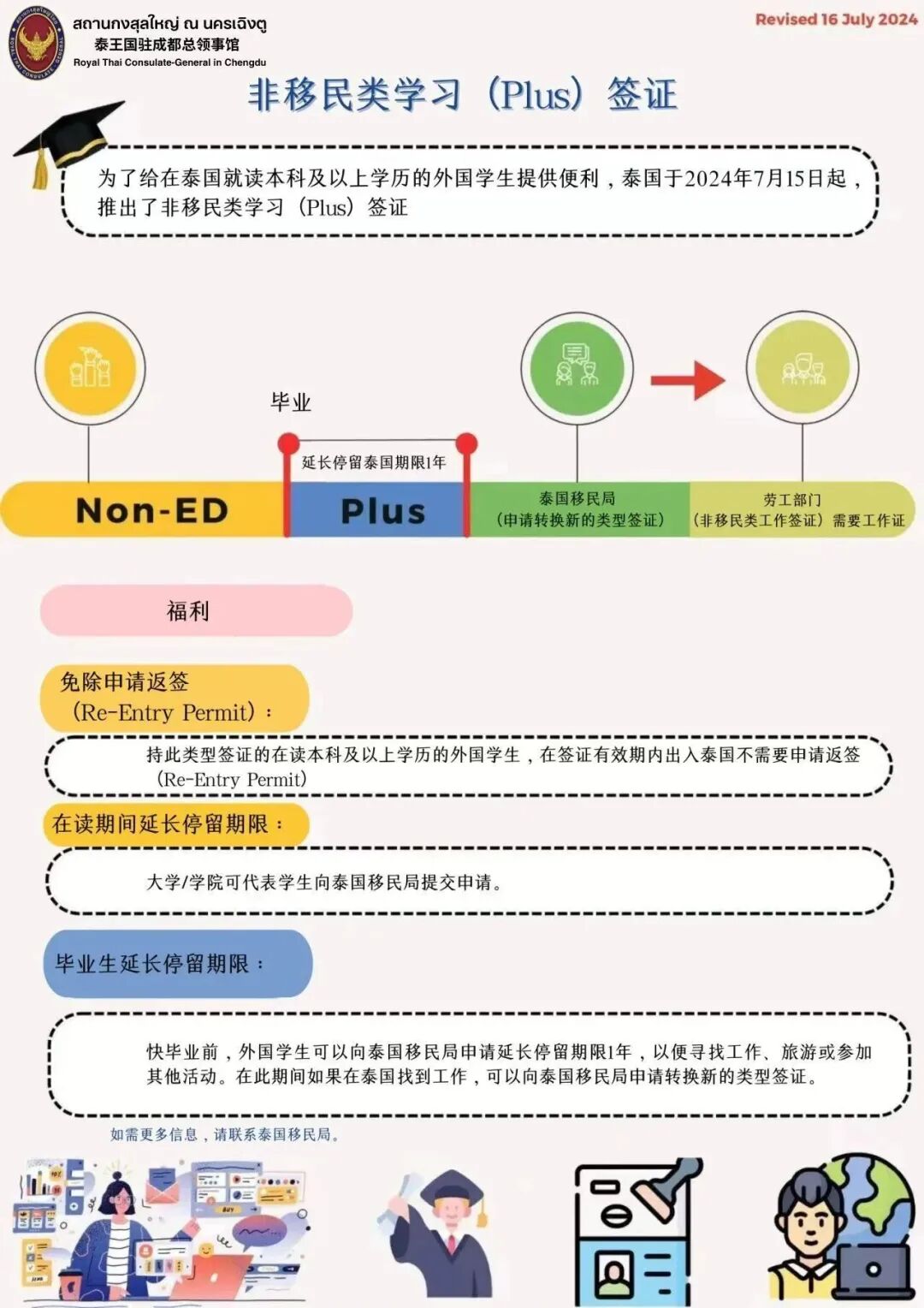 2024年7月15日起,泰国推出升级版学生签——非移民类学习(Plus)签证(Non-Immigrant ED Plus Visa,简称“ED Plus”) ,专为本科及以上学历外国留学生设计。相比老版学生签,ED Plus带来三大核心福利,能大幅简化留学期间的出入境与停留流程,现为你梳理完整办理指南,助你高效准备。