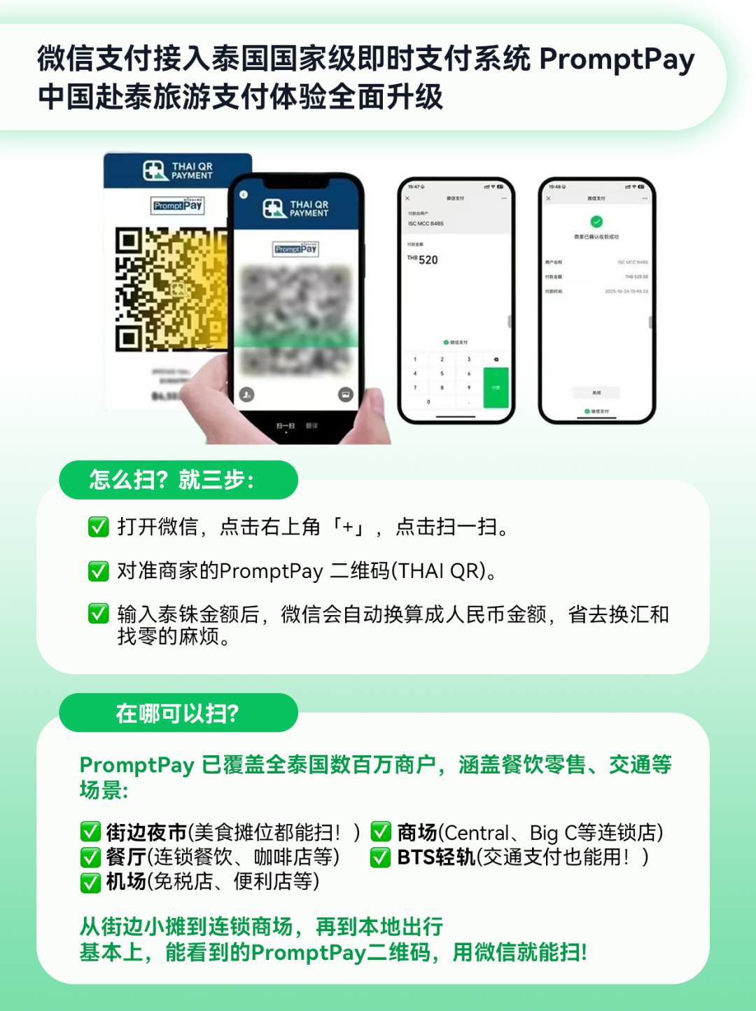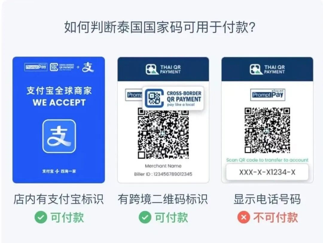 温馨提示:个人收款码(下图所示,底部显示收款人电话号码)不能实现扫码支付;商家收款码未开通跨境服务的亦暂不支持。开通跨境服务的商家收款码会显示“CROSS-BORDER QR PAYMENT”字样,目前服务已覆盖全泰数百万商户,涵盖购物、餐饮、交通、景点等核心场景,个别小型个体商户可能暂未接入,建议出行前准备少量现金备用。