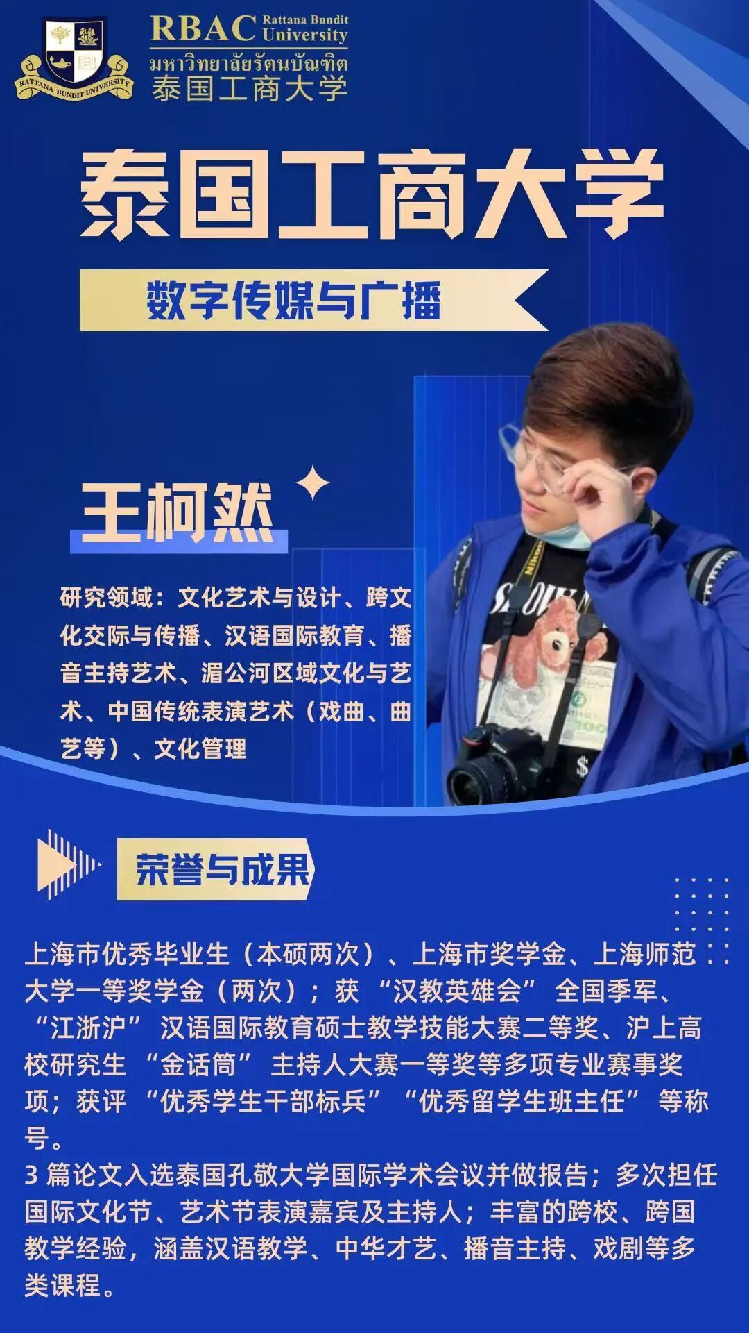 教育背景:泰国孔敬大学文化艺术与设计哲学博士、上海师范大学汉语国际教育硕士、上海师范大学文播音与主持艺术学学士