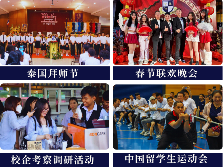 学校定期组织中泰两国文化活动:泰国拜师节、水灯节,中国春节、端午节,还有中泰学生互访、泰餐烹饪、校企考察调研、中国留学生运动会等,在体验多元文化的同时,拓展国际视野,积累实践经验。每年还会组织学生到泰国知名院校、企业考察,对接市场需求,为就业铺路。