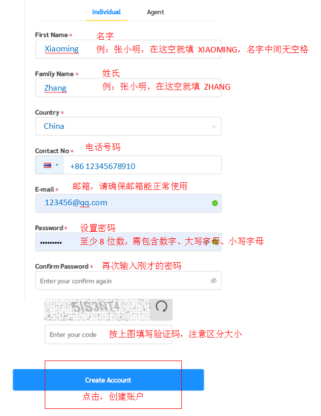 3.如图创建账户,填写账户信息、设置密码。