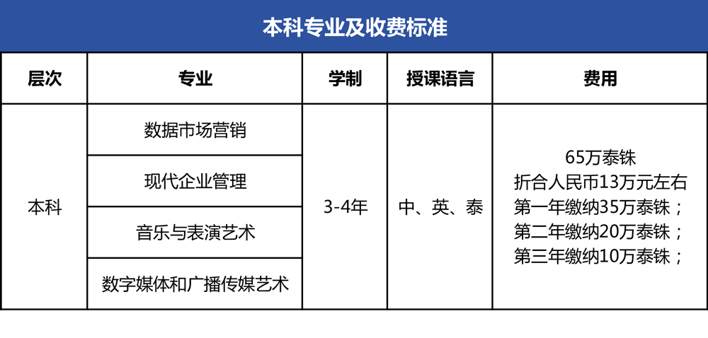 (3)本硕连读:学制6年,其中本科4年,硕士2年。最快5年-5年半可修完本硕全部学分,并申请毕业。毕业可获得泰国工商大学本科学士学位证书和硕士学位证书。